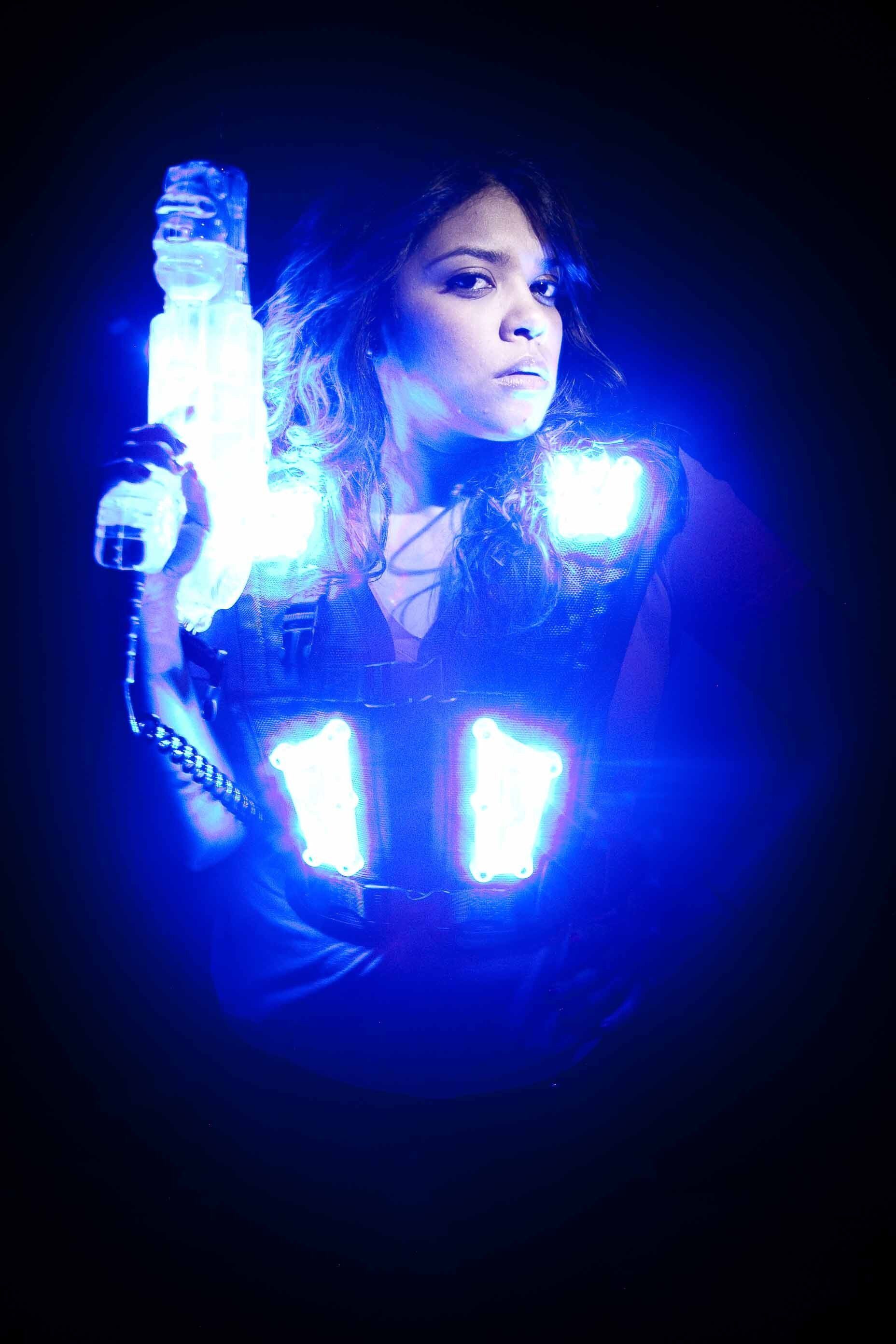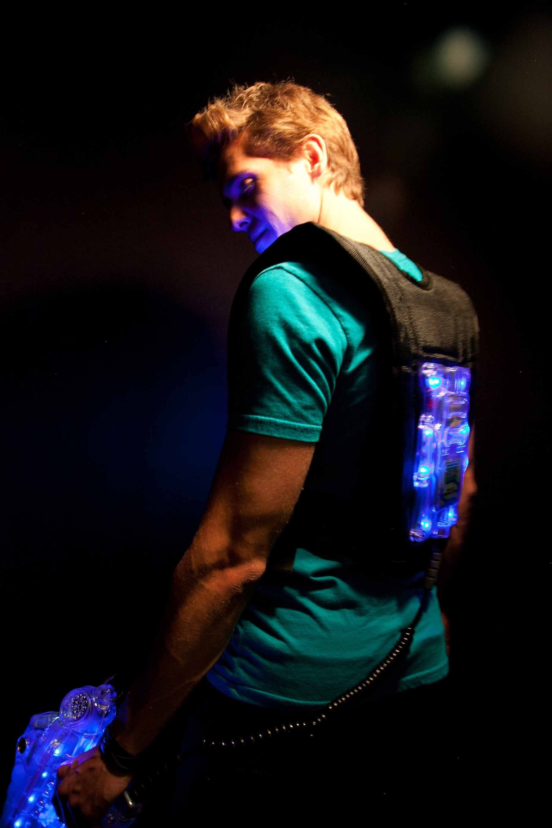 Laser tag involves physical activity. The arena is a low light environment with exposure to flashing lights, fog and lasers. There are ramps and an elevated platform.